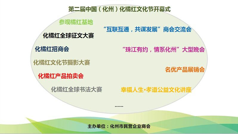 据悉,本届文化节主要活动包括:一是“丽登饼业”2015中国(化州)化橘红文化节开幕式;二是化橘红经贸洽谈会;三是参观化橘红基地;四是化橘红全球征文大赛;五是化橘红文化节摄影大赛;六是化橘红全球书法大赛;七是化橘红产品拍卖会;八是化州地方名优特产品展销会;九是“互联互通,共谋发展”商会交流会;十是广东电视台“珠江有约,情系橘州”大型晚会;十一是“幸福人生.孝道公益”文化讲座。