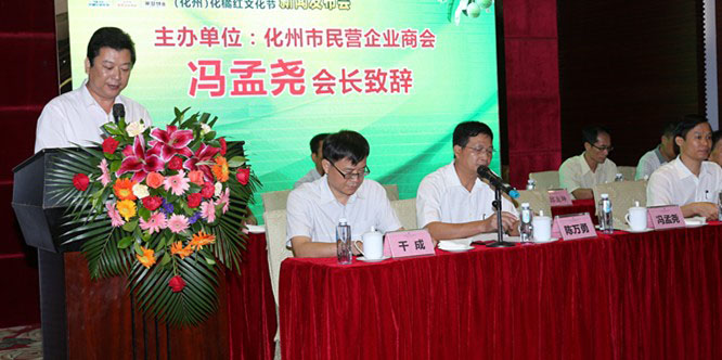 发布会上,化州市民营企业商会会长冯孟尧先生首先为2015中国(化州)化橘红文化节致辞。