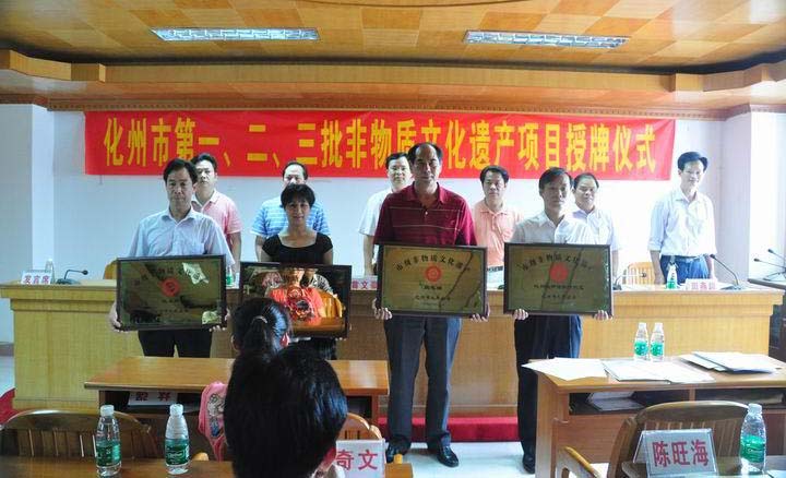 据悉,目前被评为化州市第一、二、三批非物质文化遗产名录的项目已有19项,分别是:跳花棚、跳禾楼、十八学士、 化州橘红的传说、陈鉴故事、化州木偶戏、冼太夫人在化州的故事、合江龙舟、潦口姑婆、化橘红中药文化、化州年例、化州婚俗、化州年画、合江梧村庙会、合江广福寺庙会、赛龙舟(化州赛龙舟)、笪桥黄瓜干制作技艺、笪桥隔水蒸鸡制作技艺、化州拖罗饼制作技艺。其中的跳花棚项目更是国家级的“非遗”项目,成绩十分显著。授牌仪式上,与会领导为“非遗”项目保护单位的代表进行了授牌。